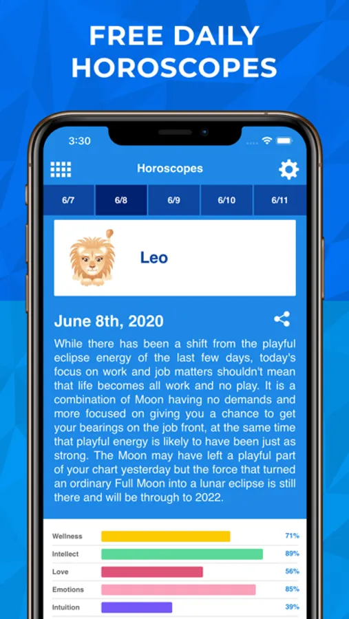 - daily predictions for: wellness, intellect, love, emotions, intuition, creativity, work and money.