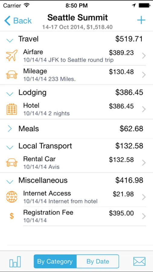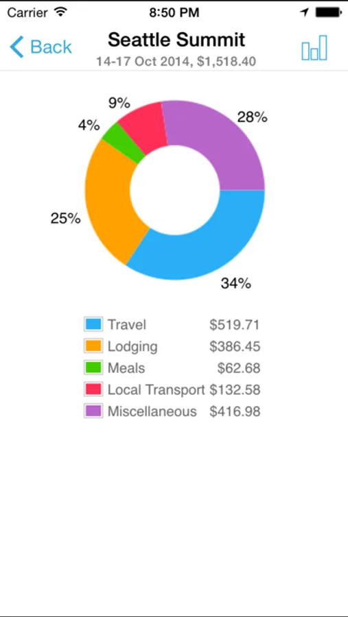 - View pie/bar chart of the expense break-down at the Trip/Project level