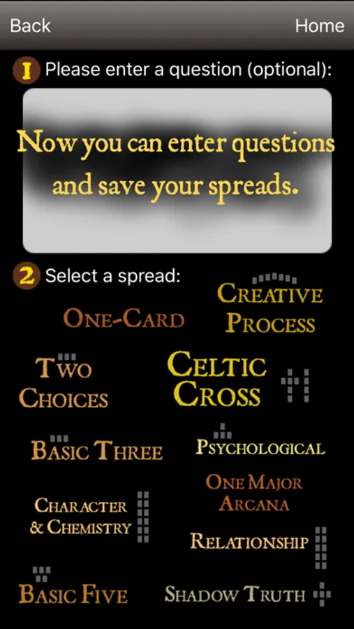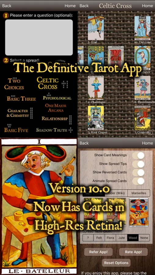 * Ten Insightful Spreads to choose from, including the classic Celtic Cross.