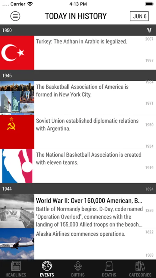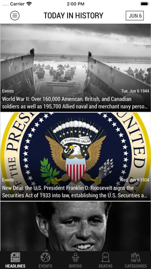 Created for History, trivia, and knowledge lovers. Get all the important events of the day or narrow your selection down to one of our specific categories: Events, Births, Deaths, Holidays, and more…