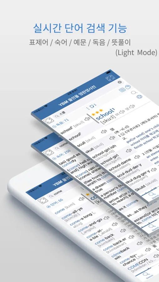 This application is a combined dictionary of “YBM All in All English-Korean Dictionary” and “YBM All in All Korean-English Dictionary” published by YBM Net, the leading language institution in Korea. It contains enormous number of headwords, words and examples including approximately 260,000 headwords and 60,000 idioms from the English-Korean Dictionary and 180,000 headwords and 240,000 examples from the Korean-English Dictionary.