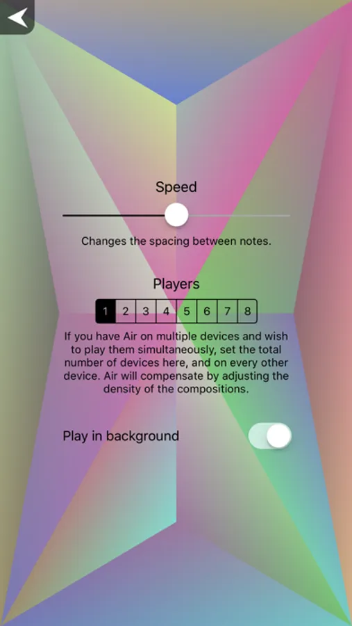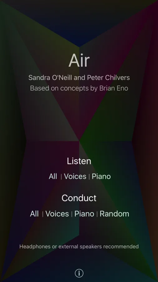 Air features four ‘Conduct’ modes, which let the user control the composition by tapping different areas on the display, and three ‘Listen’ modes, which provide a choice of arrangement. For those fortunate enough to have access to multiple iPhones and speakers, an option has been provided to spread the composition over several players.