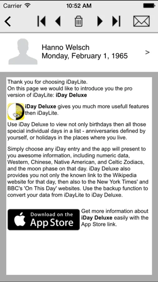 iDay is the “Deluxe Version” of iDayLite: Along with organizing birthdays, anniversaries, events, and holidays, it also will provide you with awesome information, including numeric data, Western, Chinese, Native American, and Celtic Zodiacs, the moon phase on the selected day, and much more.