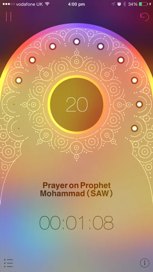 3. A detailed Subha view where tapping on the screen counts as a single Tasbeeh. A counter along with a session timer is displayed.