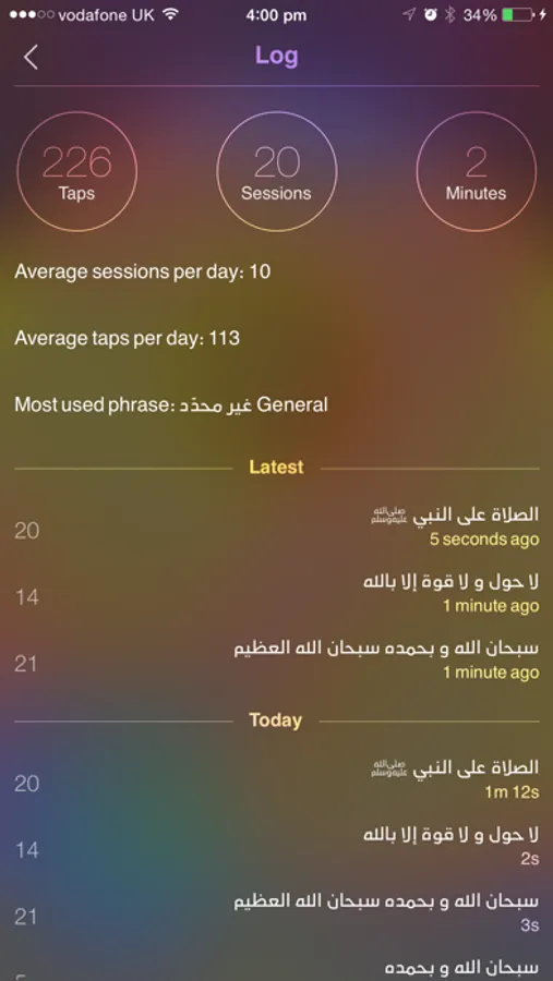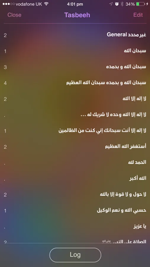 6. Full history view of all counts, times and tasbeehs performed. The Log screen allows you to easily restart a previously started session.