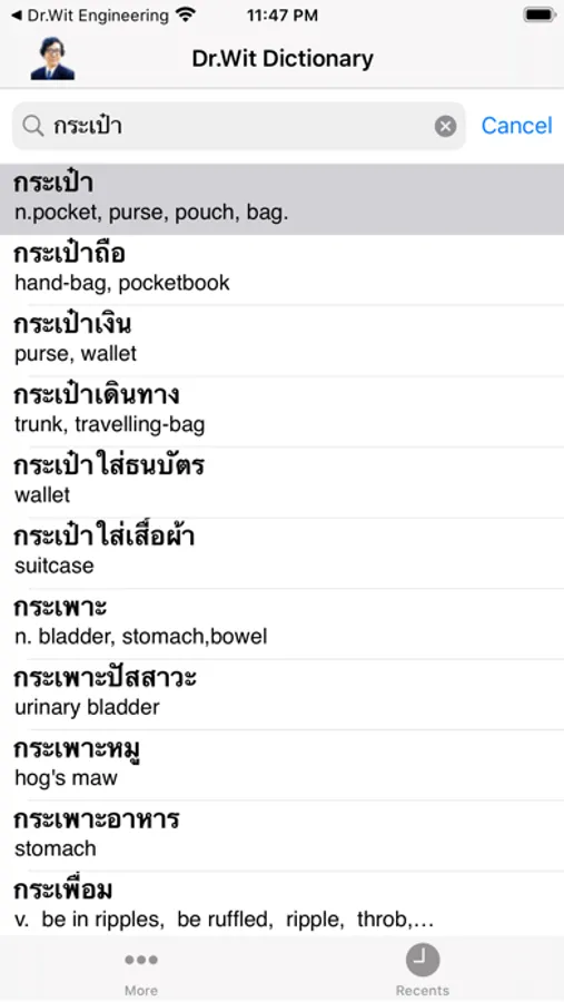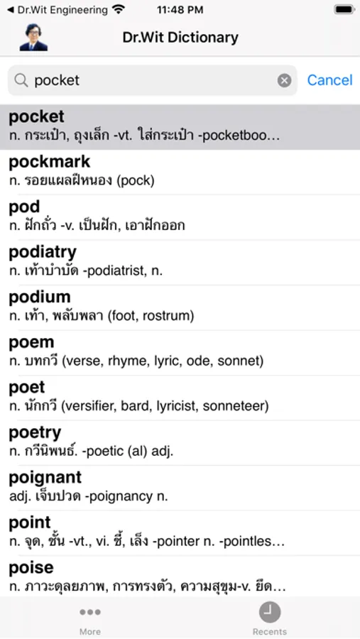 โปรแกรมพจนานุกรม Dr.Wit’s Dictionaries เป็นโปรแกรมพจนานุกรมบนเครื่องโทรศัพท์ iPhone และ iPod Touch ที่ทำให้ผู้ใช้งานสามารถค้นหาคำศัพท์คำแปลได้อย่างรวดเร็วที่สุด แสดงตัวสะกดคำอ่านทั้งไทยและอังกฤษแสดงความหมายได้อย่างครบถ้วน สะดวกง่ายดายในการค้นหาเพียงป้อนตัวอักษรก็จะเริ่มค้นหาคำศัพท์ สามารถดูคำก่อนหน้าและถัดไปได้อย่างง่ายดายสามารถใช้งานได้โดยไม่ต้องเชื่อมต่ออินเทอร์เน็ต