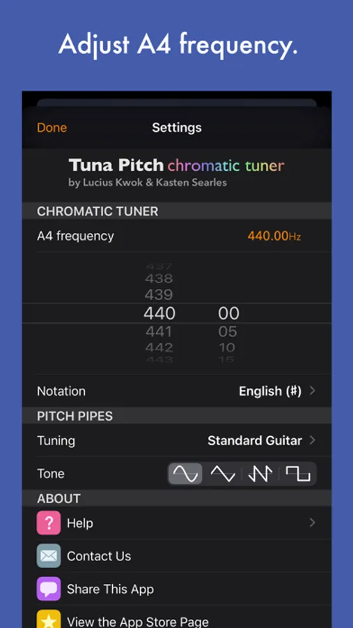 • Editable A4 reference frequency, with A440 standard tuning (A4 = 440Hz).