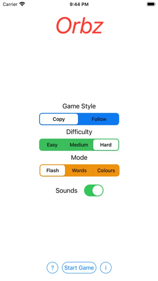 Words: Flashes a word representing each orb colour on the screen, instead of flashing the Orbz.