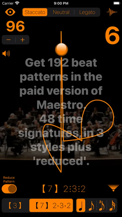 Conductor's Point of View - automatically flips the beat pattern for conductors to learn and practice the patterns. This mode shows you the path the tip of your baton should take while conducting.