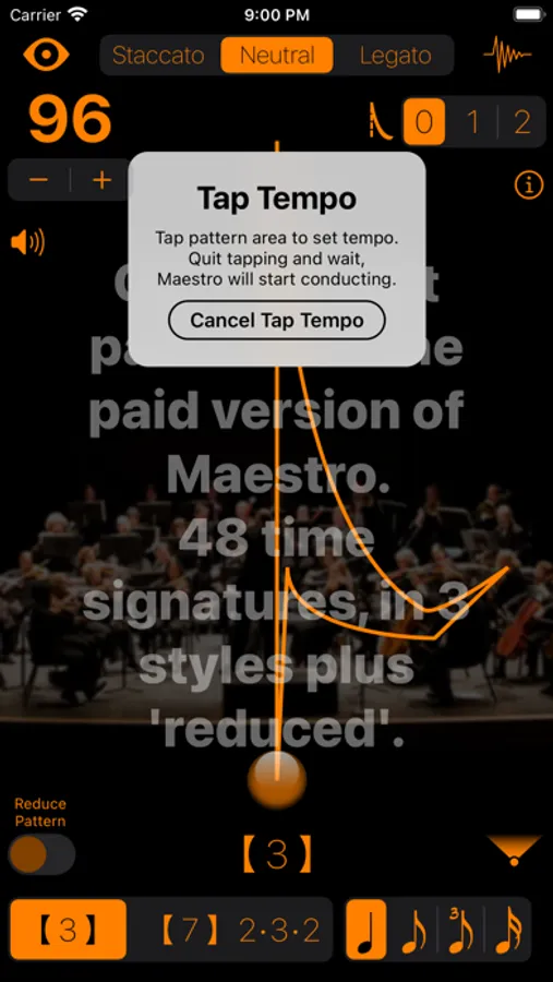 Long Press triggers Tap Tempo, tap anywhere more than twice to set the tempo. Then wait and it will start conducting.