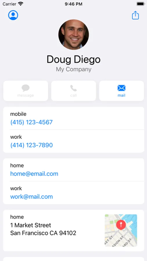 Me allows you to easily view and share your contact. To set it up, select your contact from your address book. Every subsequent time you launch Me, you will see your contact information. No more digging and fumbling through your phone to find your phone number.