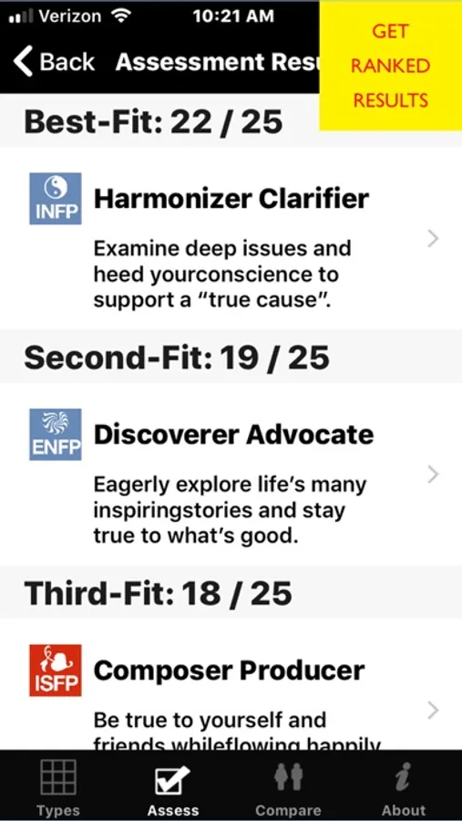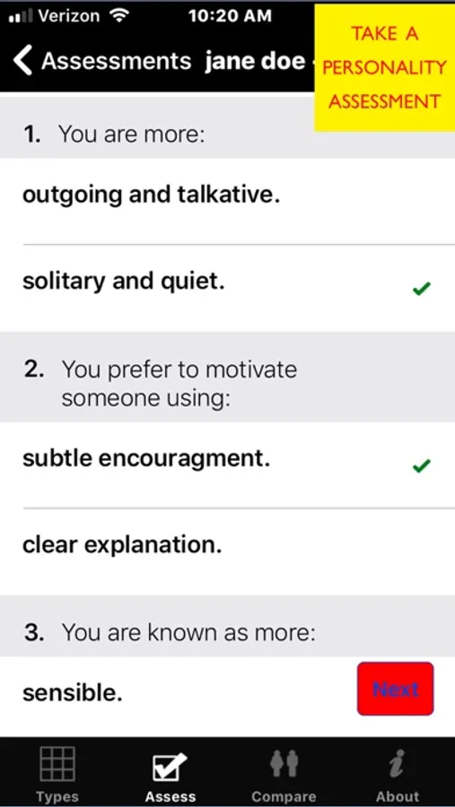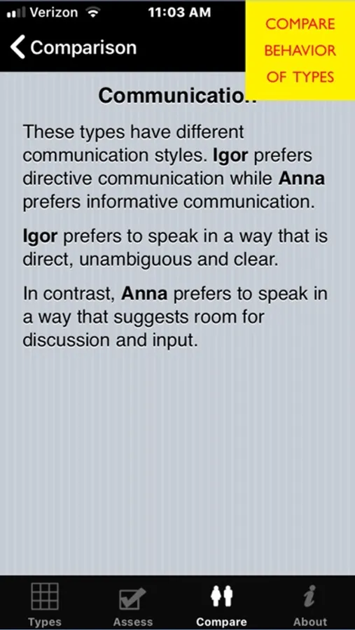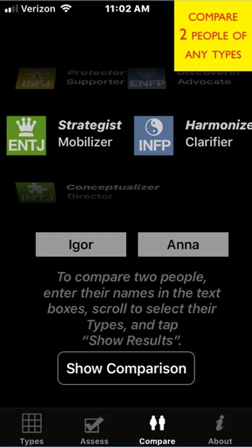 You will quickly learn about Type Theory and how to positively influence others using the “Compare” feature. This feature relies on sophisticated algorithms to show you the likely commonalities, differences, and synergies between two people. The algorithms compare communication, problem solving, learning and adaptation, love relationships, growth and change, and more.