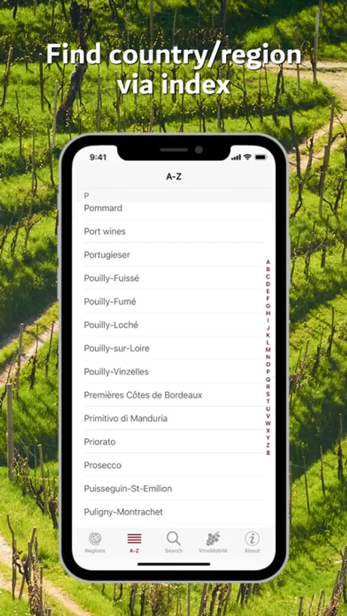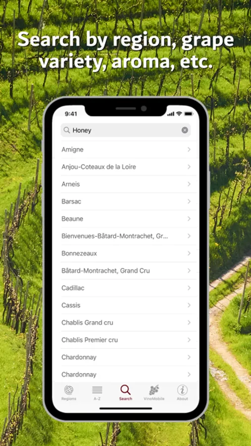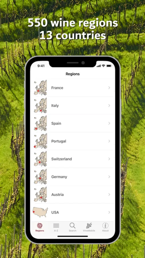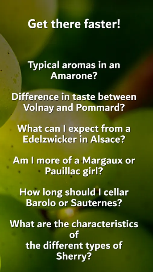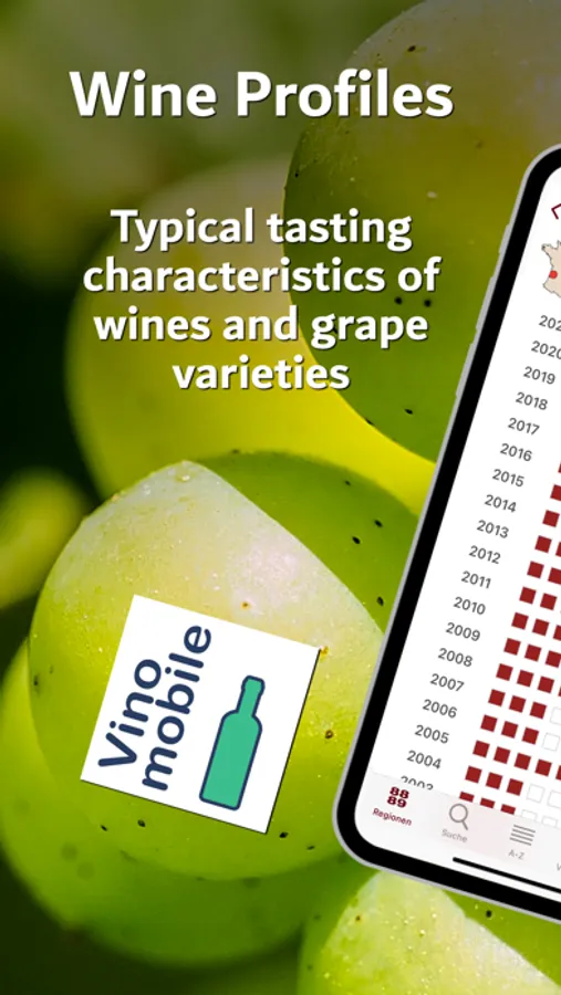 In this app, you'll find the typical characteristics of about 1,300 wines and grape varieties from 550 regions and 13 countries, as well as grape variety shares, quality ratings, and shelf life of wines from these regions.