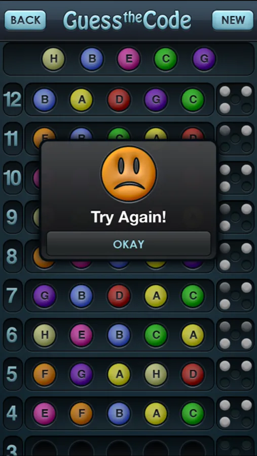 Please Note: The result pegs do not correspond directly to the guess pegs. The result pegs tell you the number of guess pegs that are in the right position or are the right color, but not which ones. The code does not change over the course of the game and it is definitely possible to figure out the code in the number of guesses allotted.