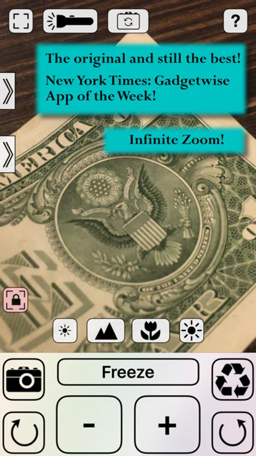 "Two other built-in features I like about Magnifying Glass: the button that instantly resets the image to low magnification and the camera button which lets you take a photo of your close up." - Roy Furchgott, New York Times