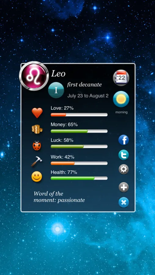 You get three decanates, including separate predictions for the day and the evening for all twelve classical astrology signs: