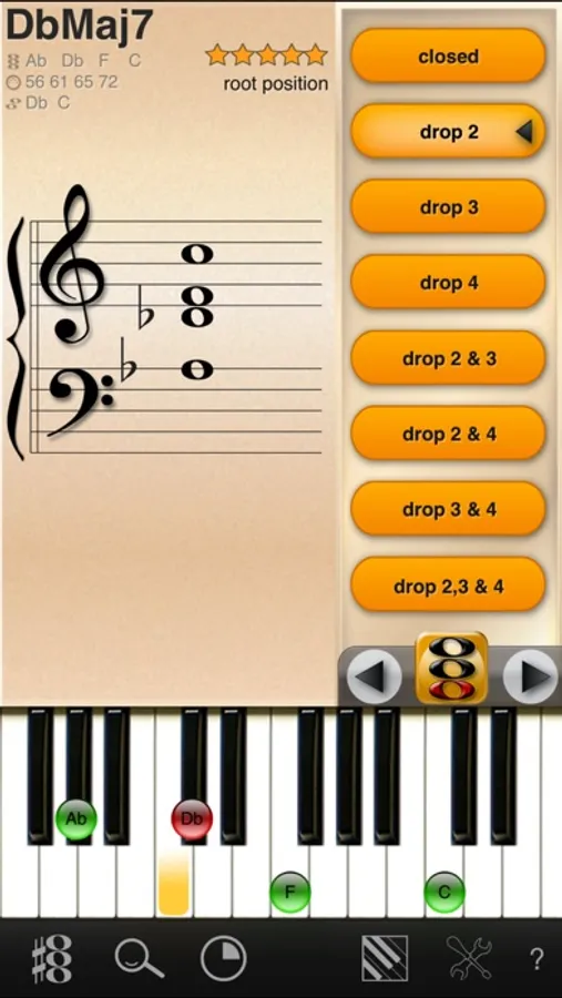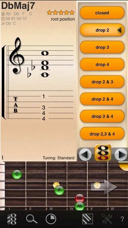 Four-part harmony may feel restrictive on instruments capable of more than 4 voices, but for a small choir for example it is a basic fact of life. It has become a staple in modern music as well as it allows the accompanist to declutter the spectrum in a sense by playing fewer notes. Root and fifth substitutions are applied automatically when dialing up a chord in ChordLab. Simply like that. Once the quality of a chord has been set it can then be viewed and listened to in all standard and not so standard drop voicings and moved through its inversions. This is of particular importance to guitar players as quite a few voicings are impossible to play and one may be left with rather few options. Chord spelling is also the main feature of ChordLab's Apple Watch app.