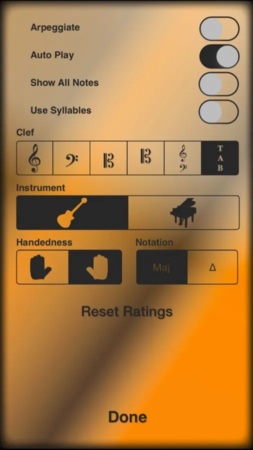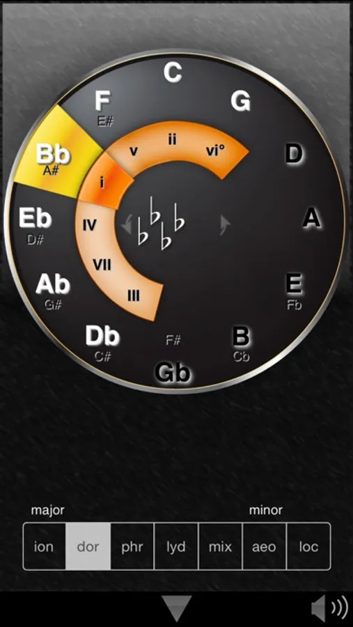 ChordLab has an interactive Circle of Fifths. With it we can look up key signatures for major and minor scales as well as all other modes derived of the major scale. So it is possible for example to display key signatures for all mixolydian scales and simultaneously highlight the other degrees for that mode. Additionally ChordLab displays degree structures for a key in standard Roman numerals. This is extremely useful when putting together chord progressions. Roots of the current harmonic domain are highlighted in white and can be tapped to audit the associated chords.