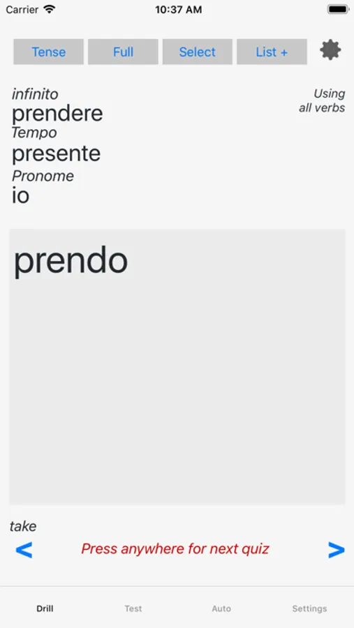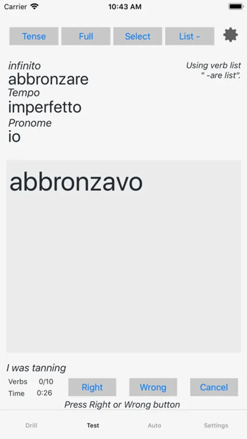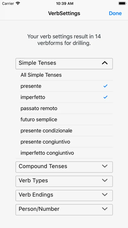 - You can narrow down your learning by selecting only certain tenses, only certain verb types ('-are' verbs and/or '-ere' verbs and/or '-ire' verbs), certain types (Regular verbs and/or Irregular verbs and/or Reflexive verbs) and certain Person/Numbers ('io' verb forms and/or 'tu' verb forms, etc.). These can be combined in any way to suit your learning needs; for example, you could drill yourself on verbs with an infinitive ending in "are", in the presente tense, only regular forms, and only in the 1st person singular person/number ("io").