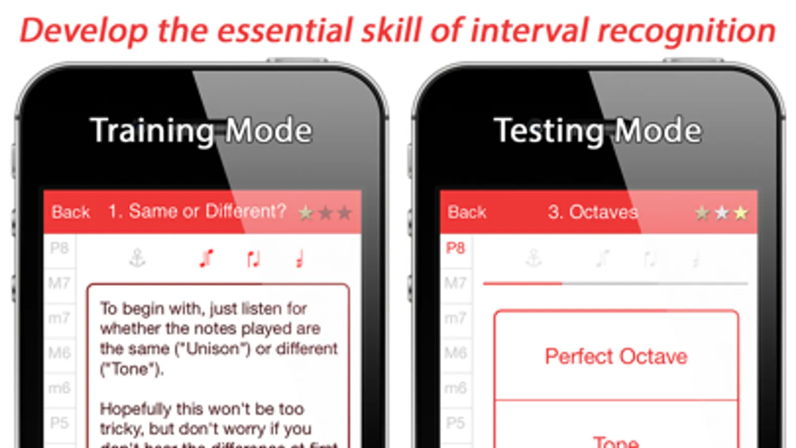 • Training Mode – 13 lessons guide you from beginner to expert, teaching you all the intervals in the octave.