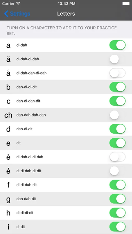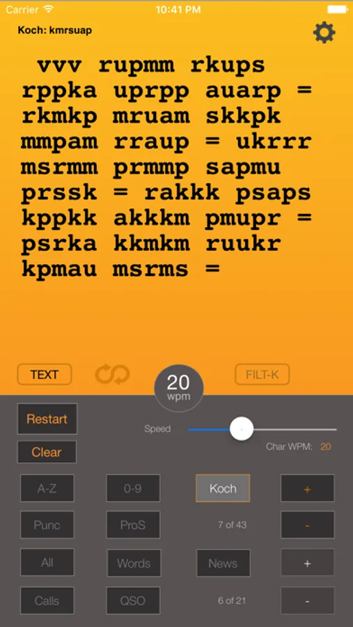 Koch - This setting uses the Koch character progression. It starts with just one letter and then you can add a new letter when you have mastered the previous character set. This is one of the most popular methods of learning the morse character set.