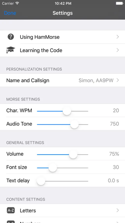 Callsigns - allows you to practice receiving random amateur radio callsigns, a mixture of letters and numbers (eg AA9PW, G1SNT, G5RV) that often prove troublesome when copying code on the air. HamMorse creates a wide variety of international callsigns using the standard ITU prefixes to provide useful practice where ever in the world you may be.
