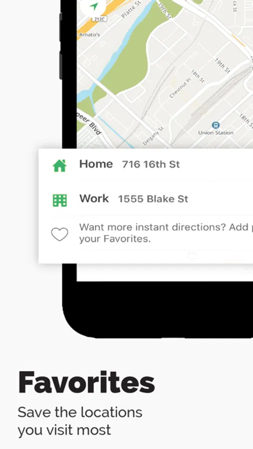 • Favorites so you can store locations, like your home and work addresses, for quick-and-easy maps and directions