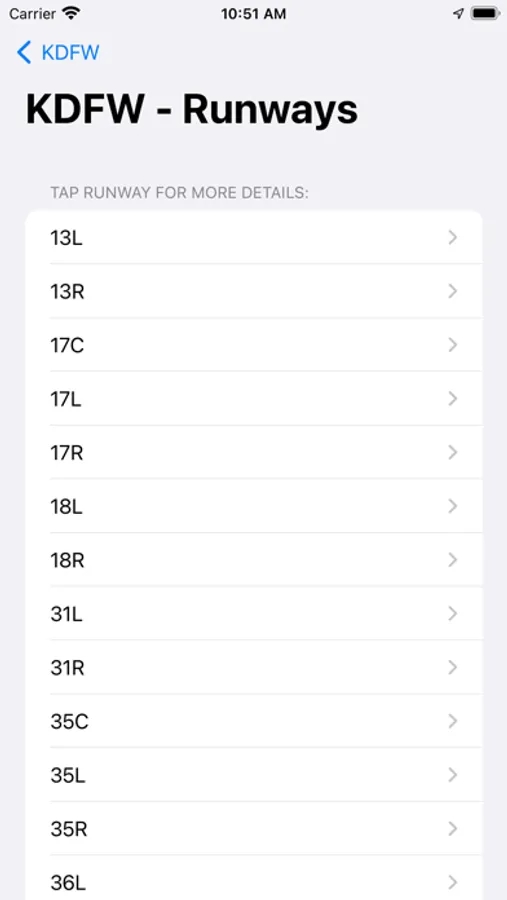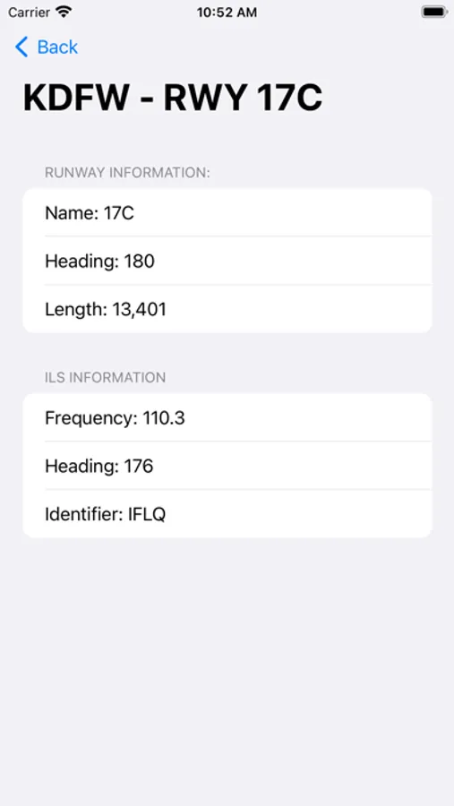 -Runway information for each runway includes length, heading and ILS identifier, heading and frequency (where applicable).