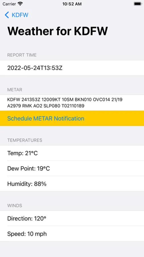 Schedule weather notifications to pushed to you whenever you want. Just select an airpot and a delivery date/time and Flight Service will deliver via a push notification that airport’s up-to-date METAR. Amazing.