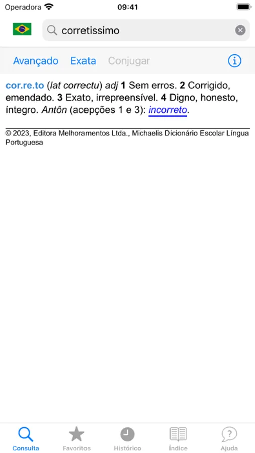 The contents of the entire dictionary follows the Portuguese Language Orthographic Vocabulary (VOLP, 5th edition, March 2009), respecting the changes introduced by the Portuguese Language Orthographic Agreement of 1990.