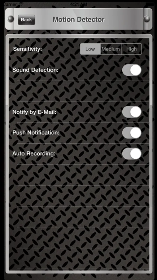 * Support motion detection, motion triggered recording, and motion triggered email notification.