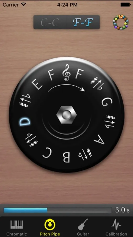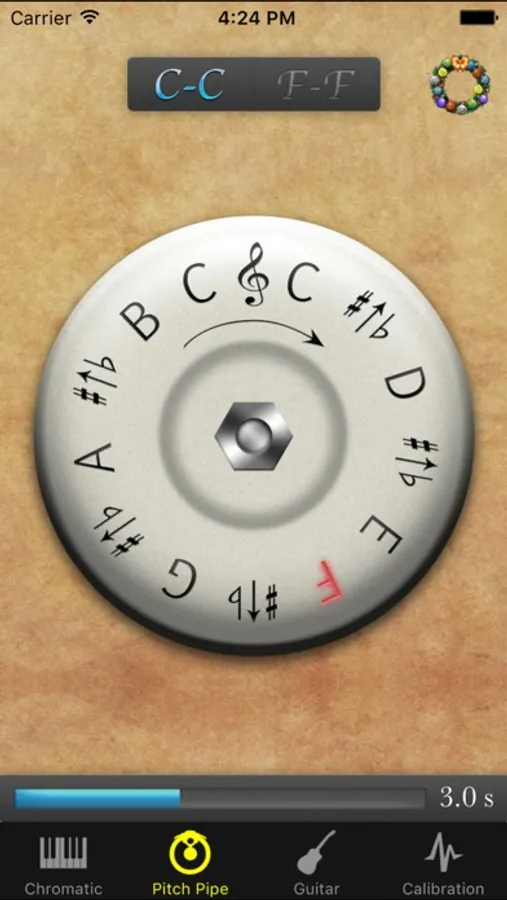 Pitch Pipe - This one is for singers used to using chromatic pitch pipes. Sounds are sampled from actual pitch pipes. Choose between C-C and F-F pipes. Tap a currently playing note to kill it immediately.