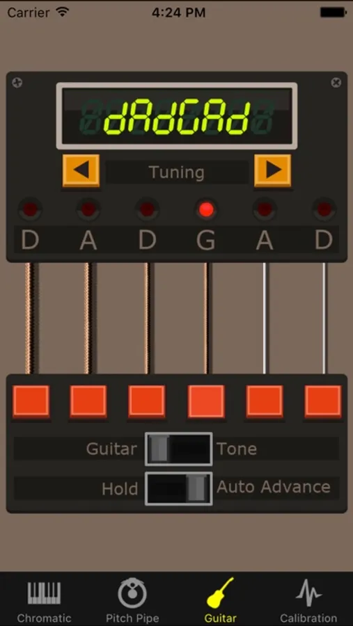 Guitar - Dedicated guitar tuner lets you tune to guitar samples in addition to the sine wave tone. Auto advance moves down the strings so you don't have to keep reaching for the phone. The following tunings are available: Standard, Dropped D, DADGAD, Open D, Open G, Open A.