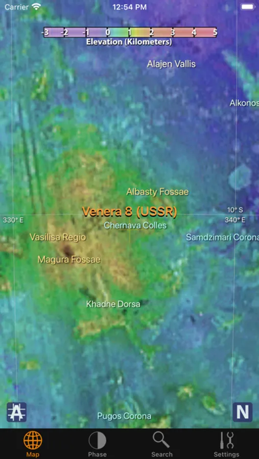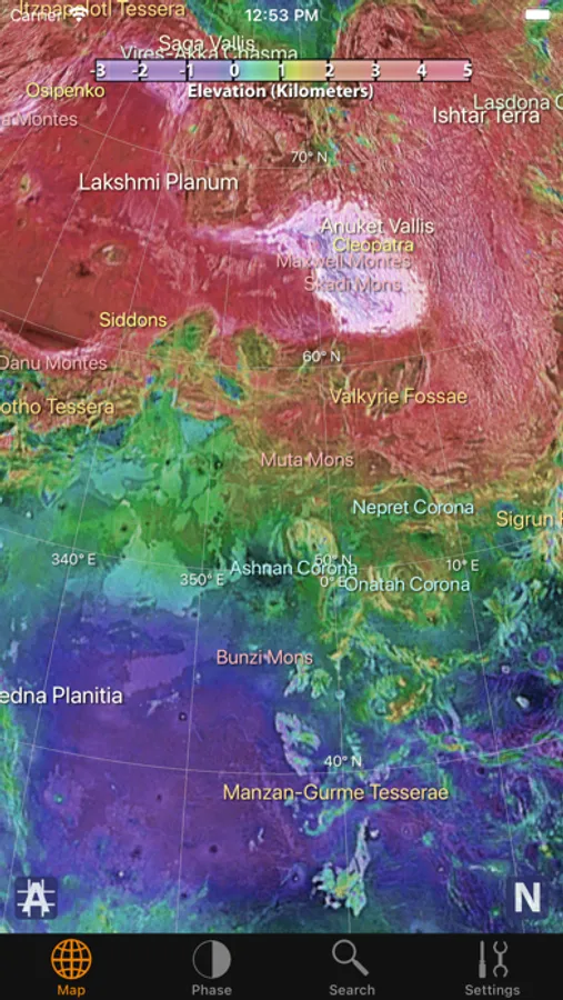 Venus Atlas is an astronomy application that lets you use pinch and finger gestures to manipulate a 3D globe of Venus. The map is shown in false color representing the topography. This surface is sadly not visible from Earth due to the constant cloud cover on Venus. As you zoom in more labels appear as finer detail comes into view. You can double tap on the labels to get more information about a particular feature.