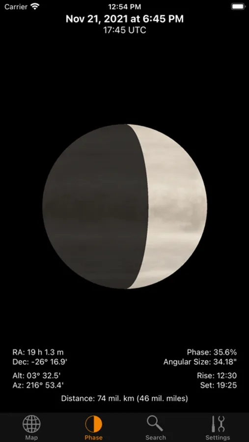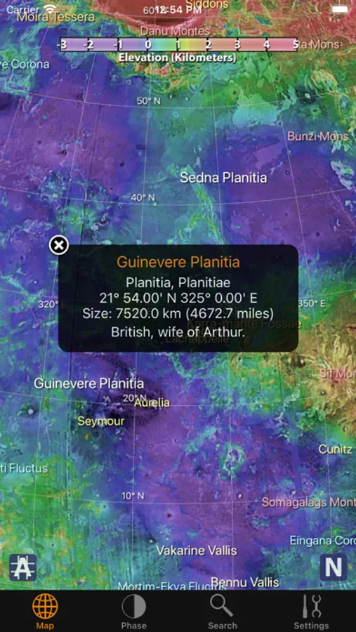 Venus Atlas also displays the phase of Venus and calculates other attributes from your chosen location and time. The feature database is searchable and can move the globe to a searched feature.