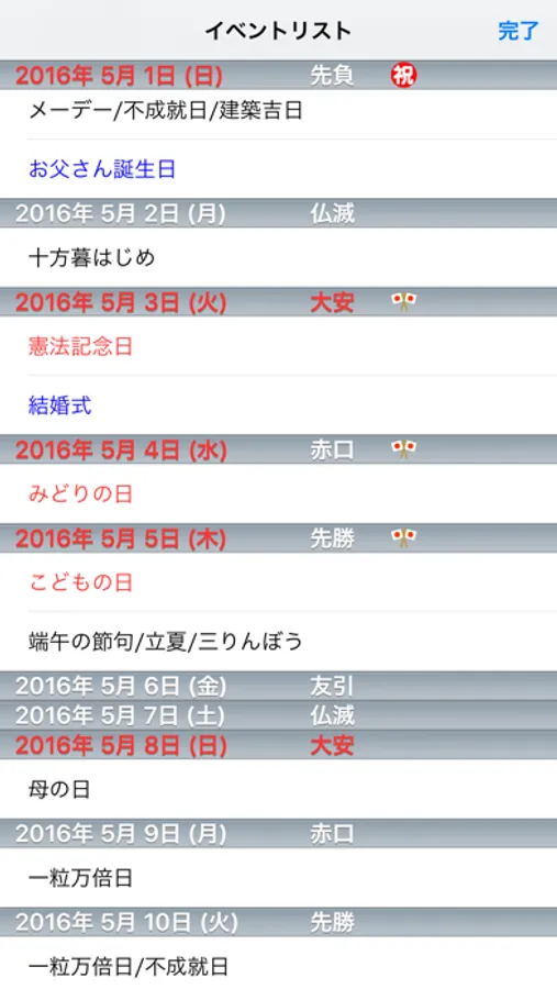 - the Rokuyo (taian, shakko, sensho, tomobiki, senpu and butsumetsu)