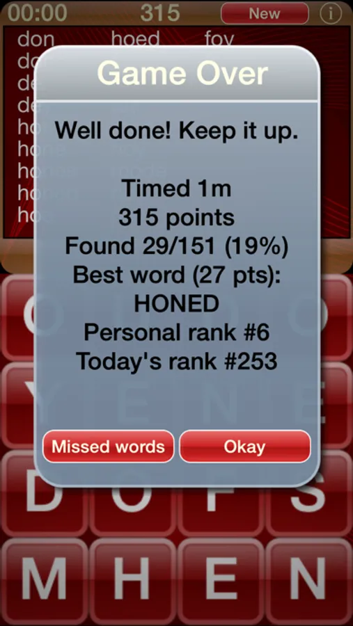 - Full report of found and missed words after a game