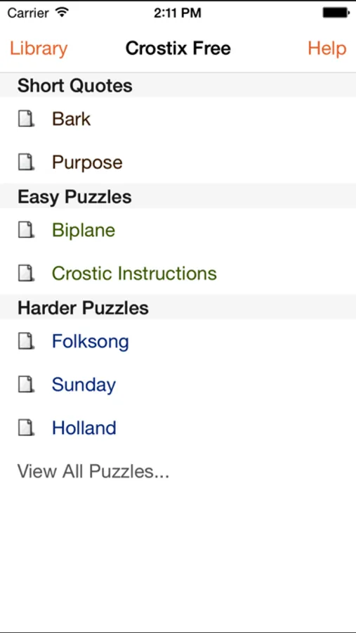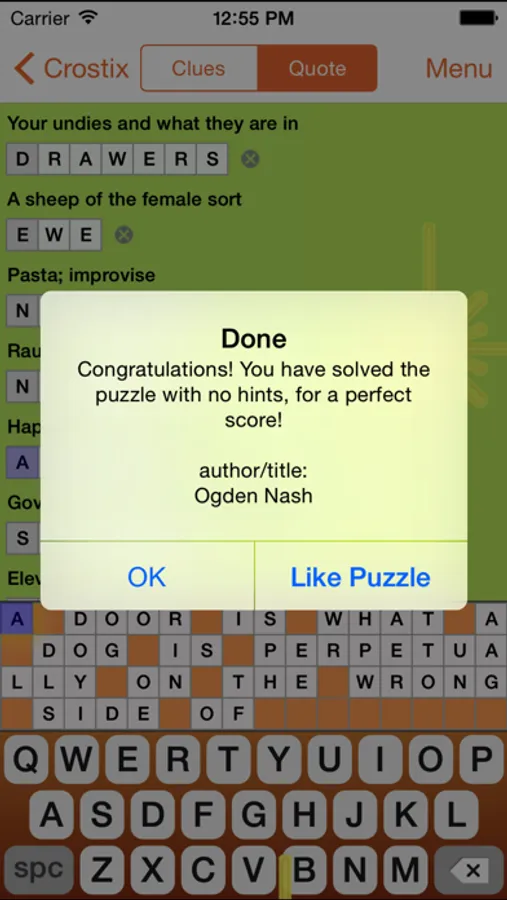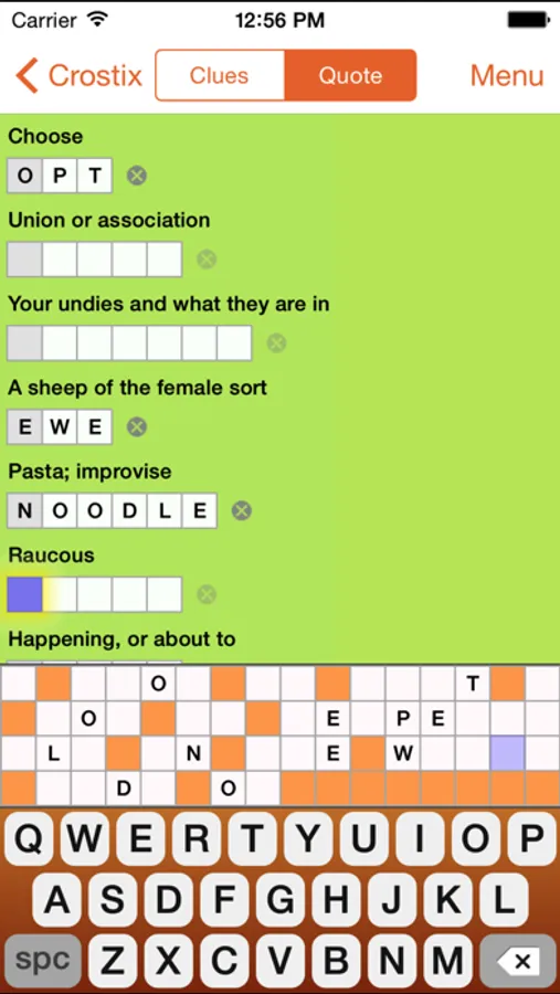 Welcome to the world of acrostics! An acrostic, also called a crostic or double crostic, is a cousin of crossword puzzles, with clues and answers whose letters are rearranged to form a quote from a famous (or not-so-famous) author. If you're familiar with acrostics, you will quickly see how convenient they are on the iPhone, because letters are automatically copied to the correct place as you type them in.