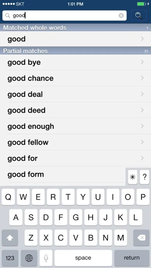 * Tapping on the headwords will start a search in any "Unidict® Engine" dictionary title you have installed.