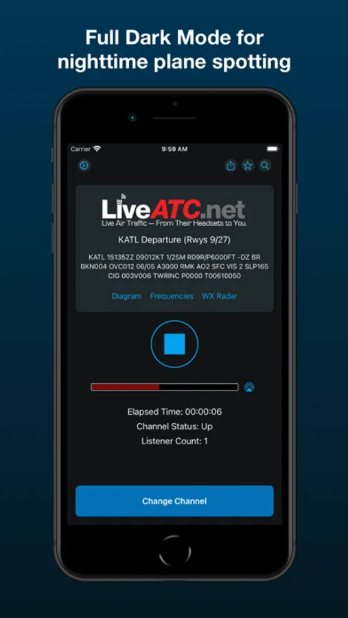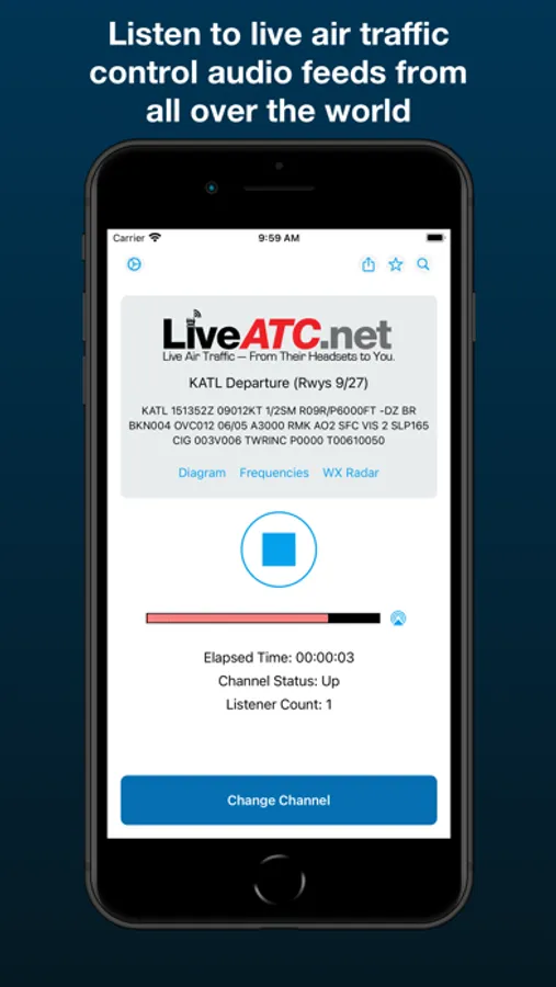 LiveATC Air Radio provides a quick and easy way to listen in on live conversations between pilots and air traffic controllers near many airports around the world. LiveATC Air Radio lets you easily browse by U.S. state, Canadian province, or by country to find an airport of interest. Once you find an interesting channel you just add it to your Favorites list for quick and easy access! You can also use the Nearby function to find airports near you.