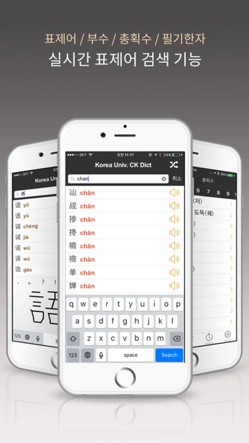 12. 부수 검색 화면에 잔여획수 표시, 총획수 검색화면에 부수 정보가 표시되어 검색이 간편하고 빠름