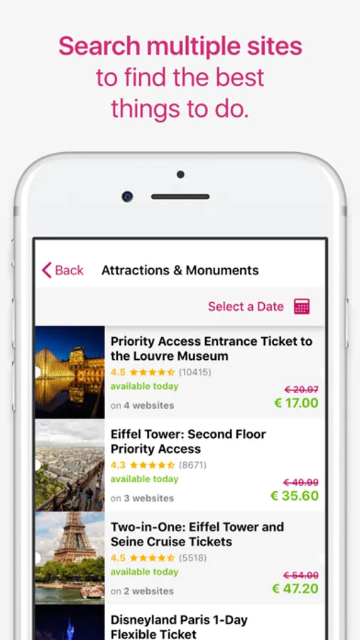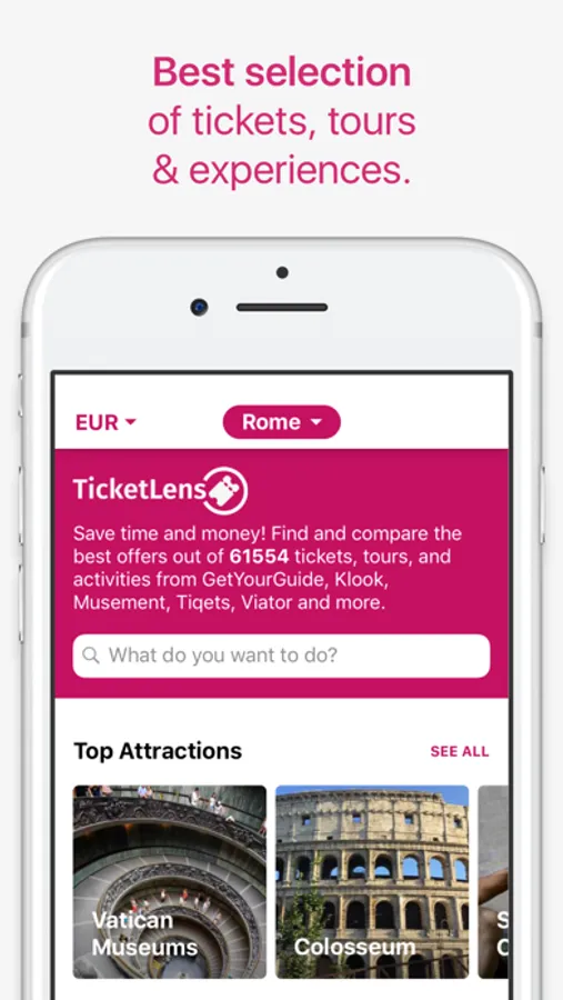 TicketLens contains the complete inventory of activities in more than 65 destinations, by aggregating all offers from hundreds of providers into one app.