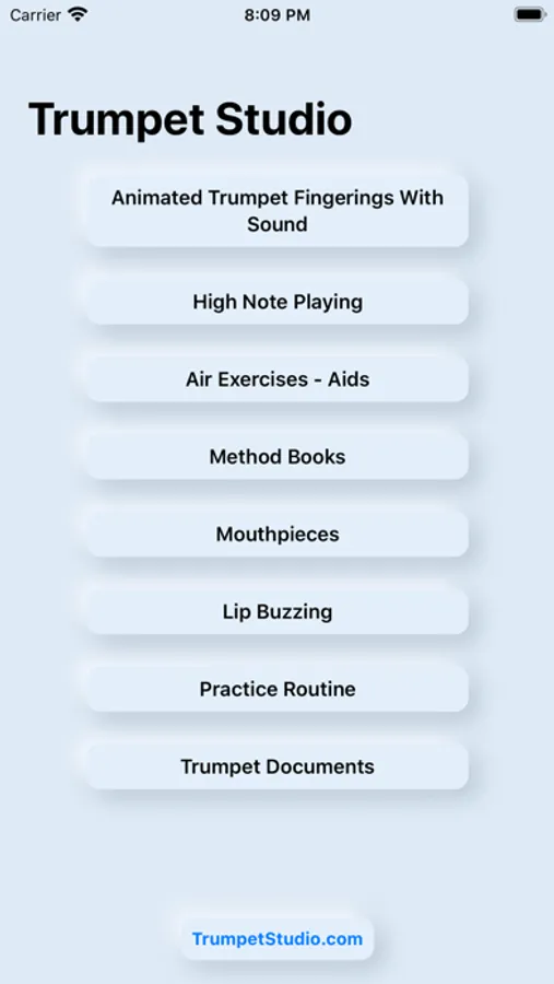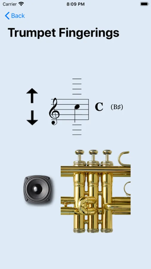 Trumpet Studio has a little in it for every level of trumpet player. First and foremost, it is an interactive, animated fingering chart with sound. Simply press the arrow up or down to see the fingering. When you want to hear the pitch, touch the speaker! Simple. Every article is written in clear, concise, and easy to understand language.