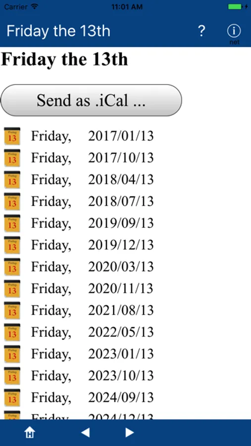 Every year one to three fridays fall on a 13th. For everyone this day has a other relevance. This program calculates all fridays the 13th for the next 50 years. With the .iCal-function you can enter these days in the calendar of the PC, Mac and the device.