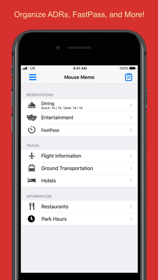 A Walt Disney World vacation requires you to keep track of a lot of information: dining reservations (ADRs), rental cars, hotels, flights, tee times, tours...and more! Mouse Memo lets you keep all of that information in one, convenient application. With Mouse Memo, you can leave that 3 ring binder in the hotel room!