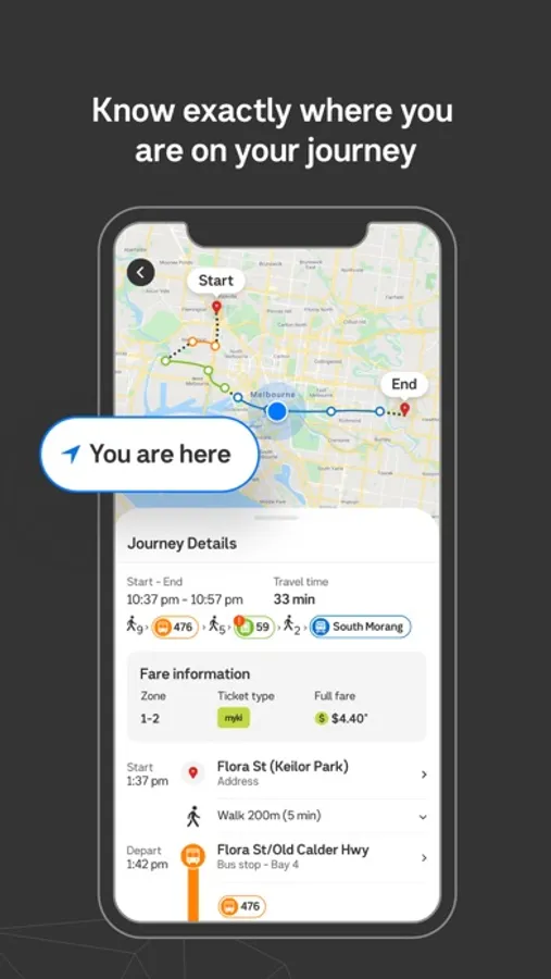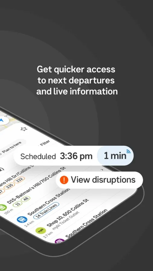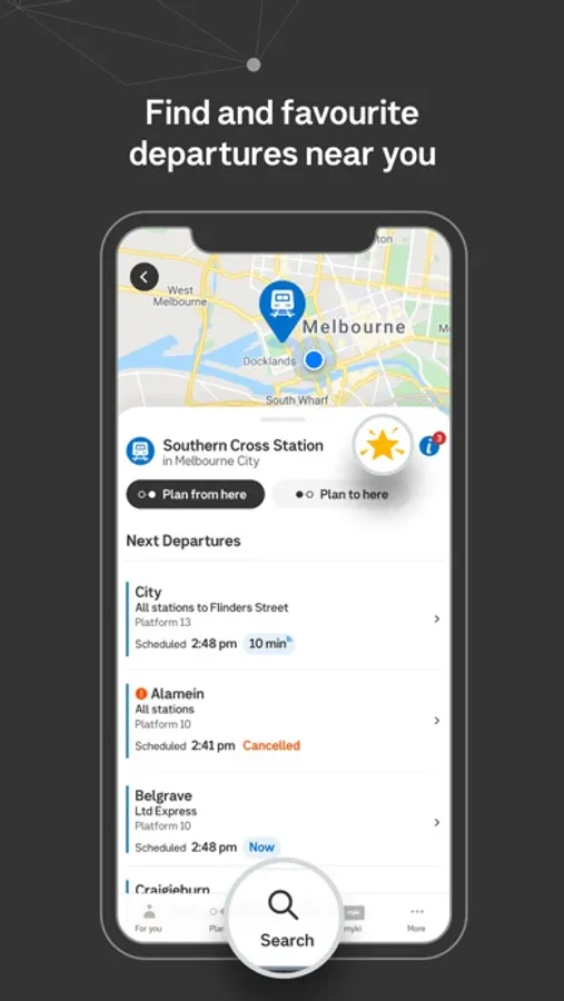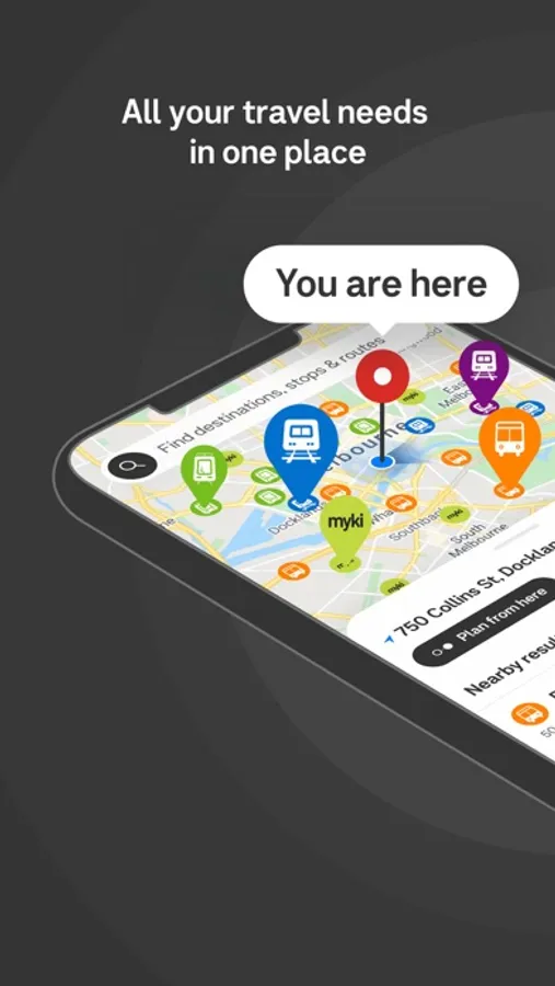 - Search: Look for destinations, stops, routes and myki outlets, or use your current location to search for nearby transport options.