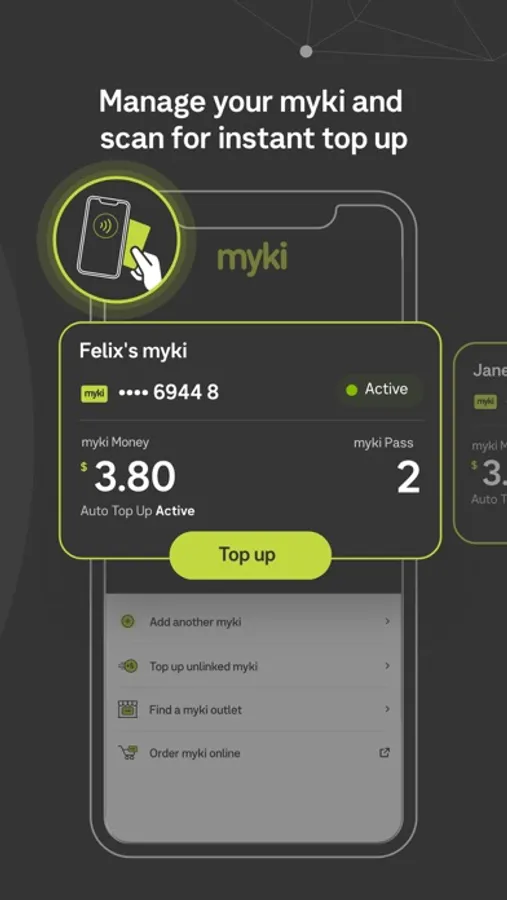 - myki top up: Hold your myki to the back of your phone to check your balance and top up instantly