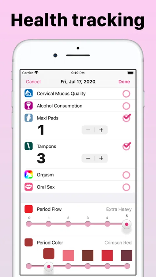 • Alcohol Consumption • Back Pain • Basal Body Temperature • Bowel Movements • Breakouts • Breast tenderness • Cervical mucus quality • Constipation • Cramp intensity • Cycle day • Exercise • Intimacy • Maxi Pad and Tampon usage • Menstrual Cup Usage • Migraines • OB/GYN checkups • Oral Sex • Orgasm • Period duration, color and intensity • Pregnancy test results • Sleep patterns • Spotting • Stressors • Vitamin regime • Weight changes • Yeast Infection • Five additional customizable items