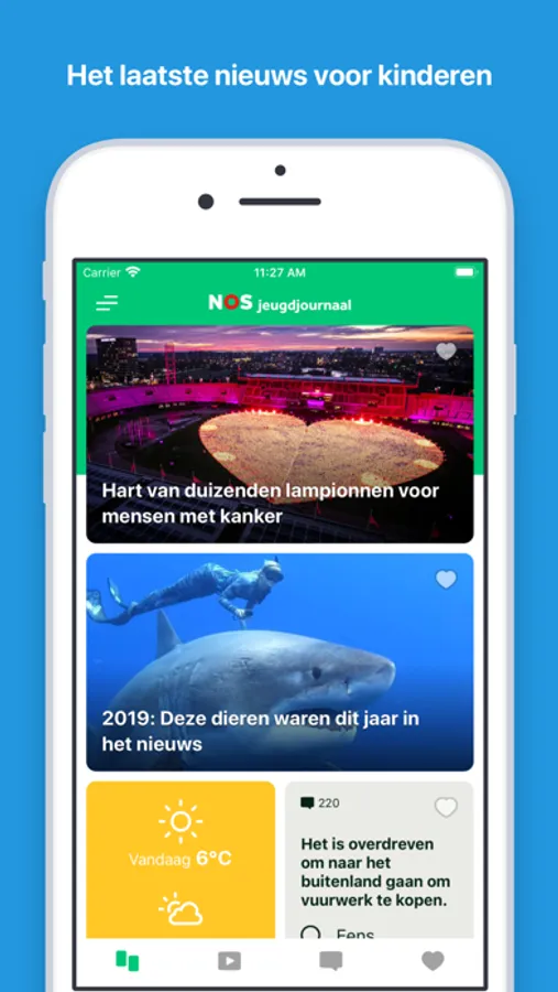 Met de Jeugdjournaal-app kun je het laatste nieuws voor kinderen altijd en overal zien. Bekijk de uitzendingen, stem op de laatste stellingen en like je favoriete filmpjes. Met de app zie je hoe het Jeugdjournaal wordt gemaakt en leer je van alles over de presentatoren. Als je een weerfoto instuurt met de Jeugdjournaal-app, komt die misschien wel in de uitzending.