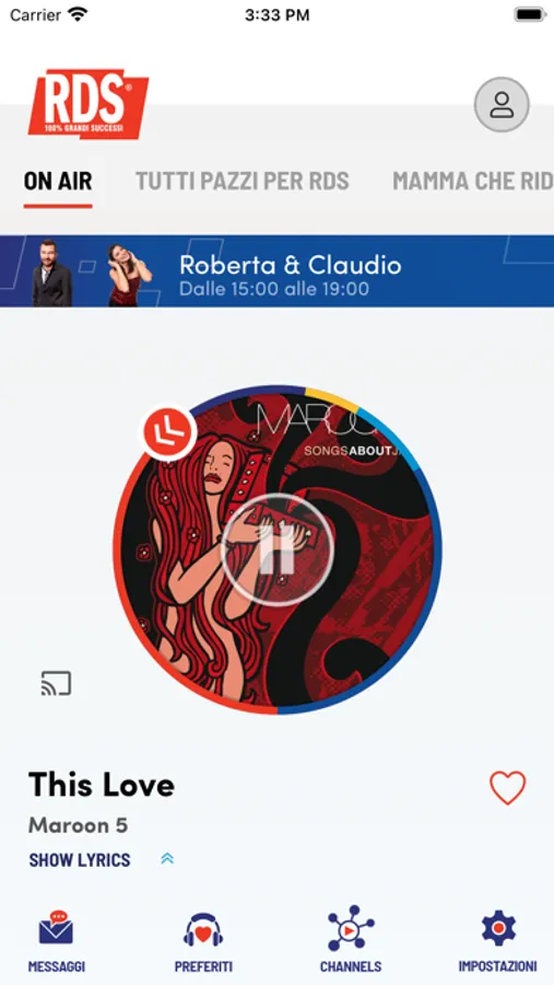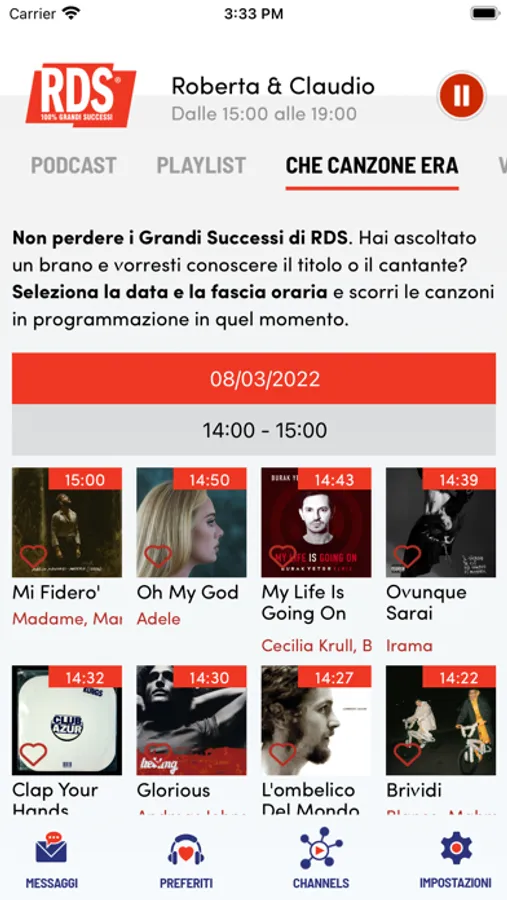 - le CANZONI PREFERITE, che potrai selezionare tra i brani della playlist RDS per sapere sempre quando saranno trasmesse